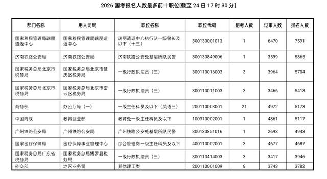 2026国考报名系统开通以来,人气榜单相对比较稳定,报名人数最多、竞争最激烈的职位均为国家移民管理局瑞丽遣返中心执行队一级警长及以下(十三)(300130001013)。这一职位仅招录1人,目前已经有7591人报名,该职位专业要求教育学类(0401),仅限本科学历,没有基层工作限制,也没有户籍限制,限女性报考。