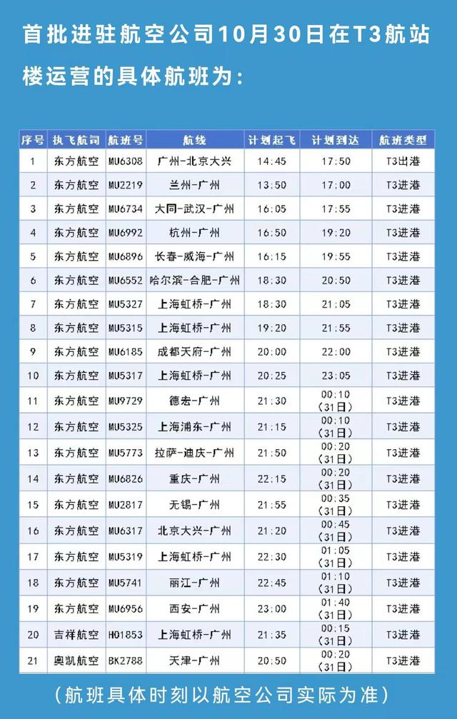 10月31日起,东方航空、上海航空、中国联合航空、吉祥航空、奥凯航空的国内进出港航班均调整至白云机场T3航站楼运营,东方航空的国际航班暂保留在T1航站楼运营。