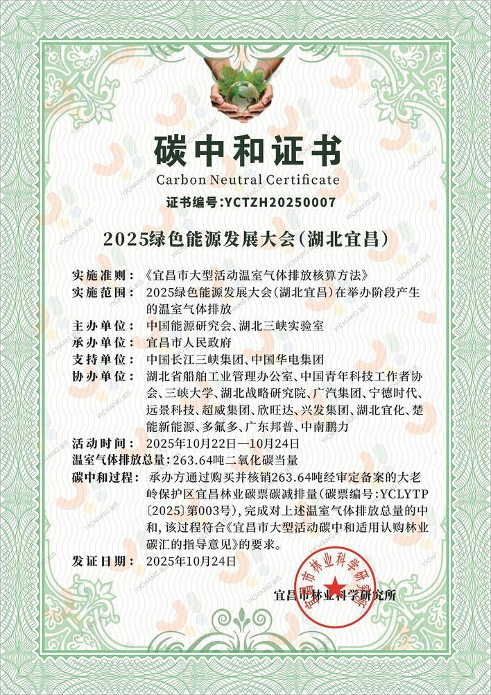 10月24日,宜昌市林业科学研究所向大会颁发了碳中和证书(证书编号:YCTZH20250007)。