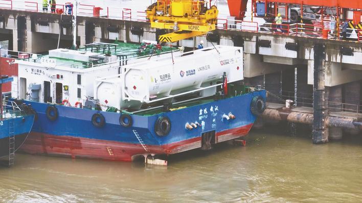 一艘名为“宏远武汉”号的LNG动力船舶在武汉完成了“换能”体验——工作人员仅用15分钟,就通过专业设备为其更换了标准化LNG燃料罐,相比传统岸机动辄3小时的加注时间大大提速。