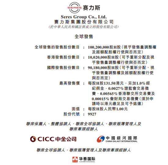 赛力斯港股最高发售价为每股H股131.50港元,另加1.0%经纪佣金、0.0027%证监会交易征费、0.00565%香港联交所交易费及0.00015%会财局交易征费(须于申请时以港元缴足及可予退还)。