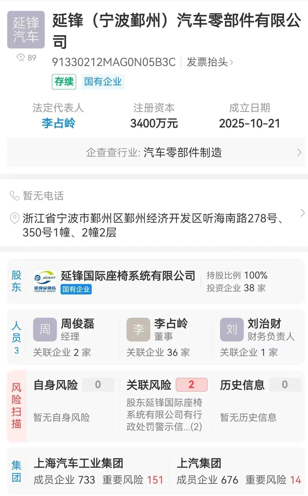 股权穿透显示,延锋鄞州由华域汽车(600741.SH)旗下延锋国际座椅系统有限公司(以下简称延锋座椅)全资持股。该公司法定代表人李占岭还担任延锋座椅北京、上海、江苏等地公司法定代表人。