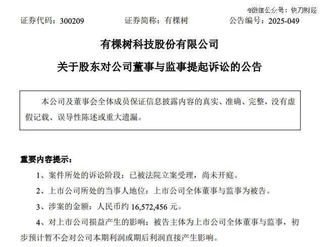 7月,有棵树的全体董事与监事被投资公司告上法庭,索赔1657万元。案件被法院立案受理。深交所同时下发问询函,直指有棵树是否存在阻碍股东依法行使权利、信息披露是否合规、董监高任职资格是否受损等关键问题,向有棵树及其董事长肖四清、董事肖燕、佘婵、唐仕莲下发监管函。