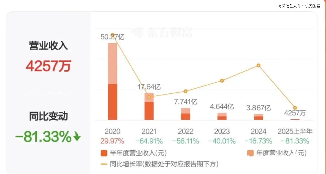 2025年上半年,有棵树营业收入为4257.34万元,与上年同期的22808.02万元相比,减少了18550.68万元,降幅达81.33%。