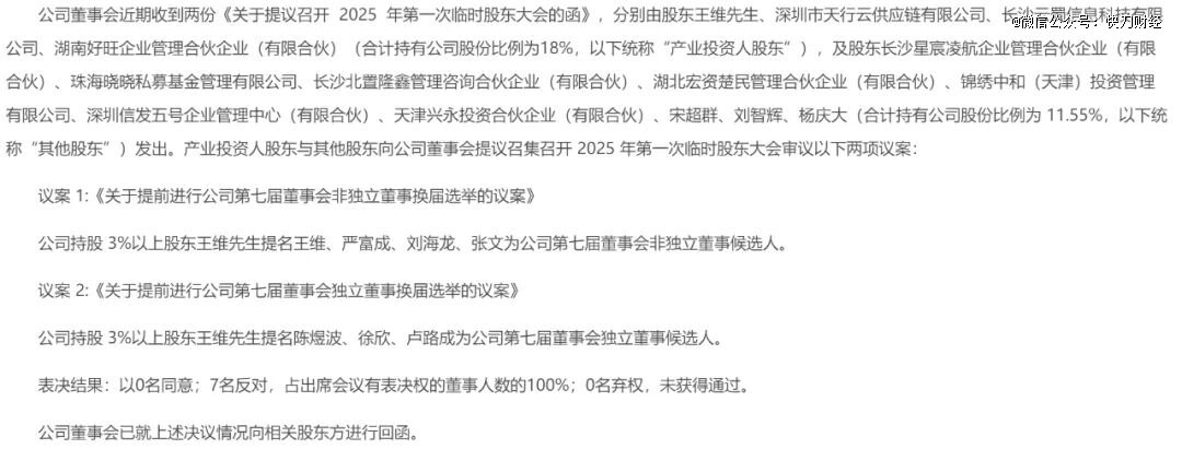 6月,长沙星宸凌航企业管理合伙企业(有限合伙)等股东提交股东大会临时提案,再提董事改选,甚至有单独股东提出“罢免全体董事”的激进提案,均被董事会以“不符合相关规定”为由驳回。