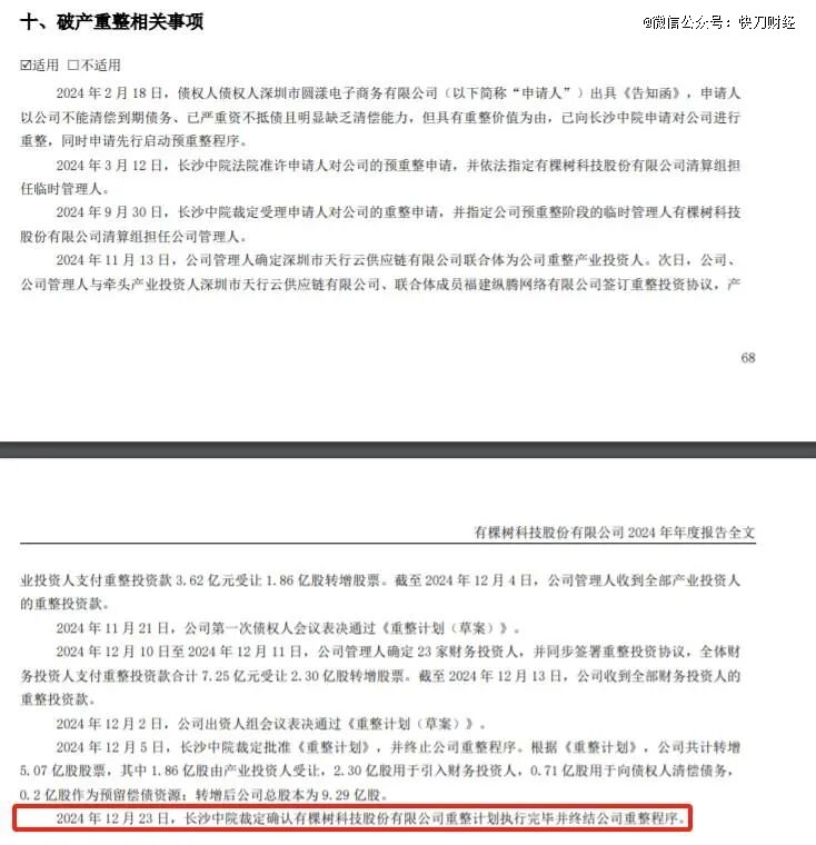 2024年12月,有棵树收到产业投资人全部重整投资款3.62亿元,有棵树得以化解了债务,顺利实现“摘帽”,暂时摆脱了退市危机。