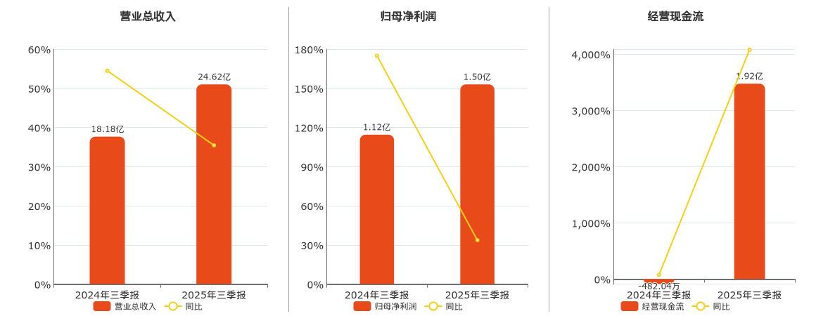 公司营业总收入为24.62亿元。归母净利润为1.50亿元。经营活动现金净流入为1.92亿元。