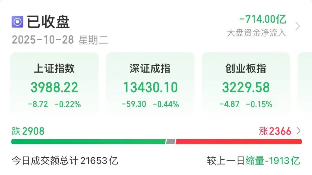 10月28日,A股冲高回落,三大指数集体收跌,沪指盘中站上4000点。