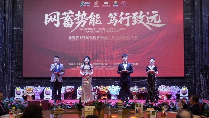 晚会现场气氛热烈,精彩节目轮番上演。十载峥嵘砥砺,共谱网球华章;岁月鎏金沉淀,同铸璀璨荣光。球友们以杯中日月致敬拼搏热血,借金徽佳酿礼赞四海情谊。金徽酒的醇香弥漫在晚宴的每个角落,它承载着体育魂,连接着宾朋意,致敬这十年荣光。