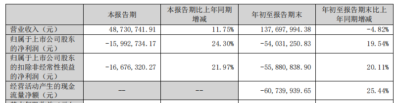 中国经济网北京10月28日讯零点有数(301169.SZ)2025年三季度报告显示,2025年前三季,公司实现营业收入1.38亿元,同比下降4.82%;归属于上市公司股东的净利润-5403.13万元,同比增长19.54%;归属于上市公司股东的扣除非经常性损益的净利润-5588.08万元,同比增长20.11%;经营活动产生的现金流量净额为-6073.99万元,同比增长25.44%。