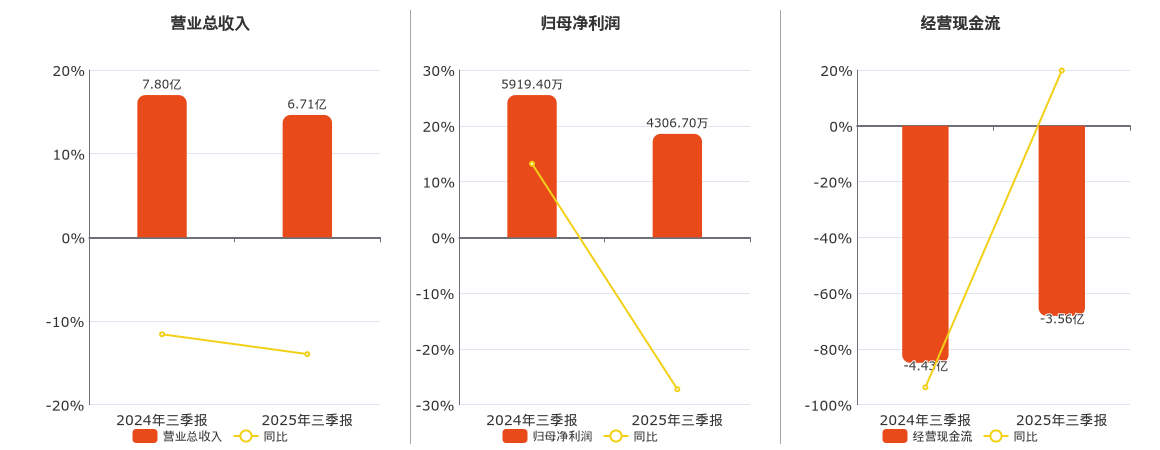 公司营业总收入为6.71亿元,在已披露的同业公司中排名第10,较去年同报告期营业总收入减少1.09亿元,同比较去年同期下降13.96%。归母净利润为4306.70万元,在已披露的同业公司中排名第11,较去年同报告期归母净利润减少1612.70万元,同比较去年同期下降27.24%。经营活动现金净流入为-3.56亿元,在已披露的同业公司中排名第20,较去年同报告期经营活动现金净流入增加8783.61万元。
