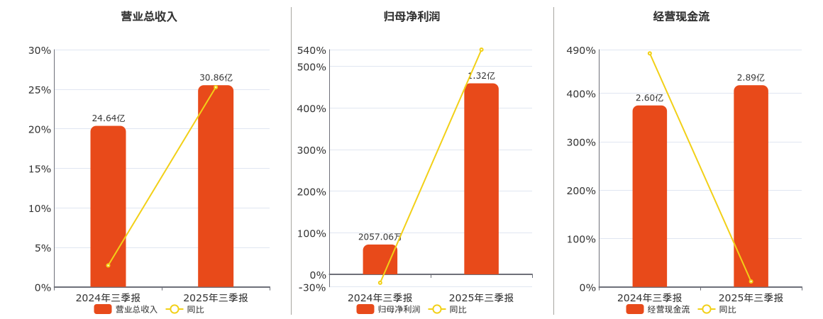公司营业总收入为30.86亿元。归母净利润为1.32亿元。经营活动现金净流入为2.89亿元。