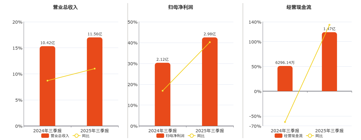 公司营业总收入为11.56亿元。归母净利润为2.98亿元。经营活动现金净流入为1.47亿元。