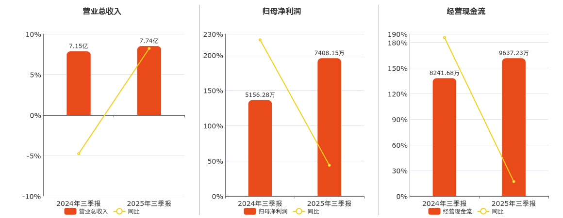 公司营业总收入为7.74亿元,在已披露的同业公司中排名第111。归母净利润为7408.15万元,在已披露的同业公司中排名第94。经营活动现金净流入为9637.23万元,在已披露的同业公司中排名第80。