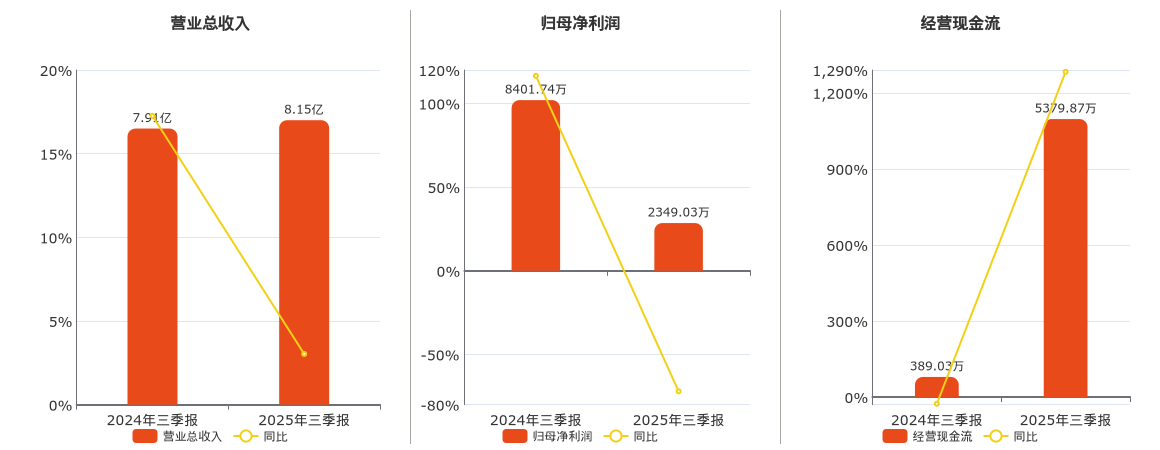 公司营业总收入为8.15亿元,在已披露的同业公司中排名第11,较去年同报告期营业总收入增加2399.62万元,实现3年连续上涨,同比较去年同期上涨3.03%。归母净利润为2349.03万元,在已披露的同业公司中排名第12,较去年同报告期归母净利润减少6052.71万元,同比较去年同期下降72.04%。经营活动现金净流入为5379.87万元,在已披露的同业公司中排名第11,较去年同报告期经营活动现金净流入增加4990.85万元,同比较去年同期上涨1282.91%。