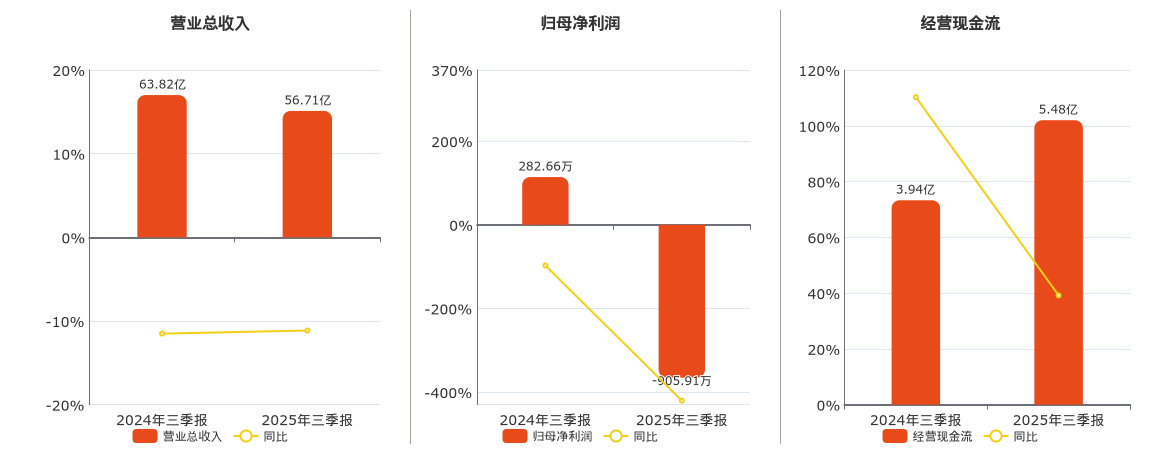 公司营业总收入为56.71亿元,在已披露的同业公司中排名第3,较去年同报告期营业总收入减少7.11亿元,同比较去年同期下降11.14%。归母净利润为-905.91万元,在已披露的同业公司中排名第5,较去年同报告期归母净利润减少1188.57万元,同比较去年同期下降420.49%。经营活动现金净流入为5.48亿元,在已披露的同业公司中排名第4,较去年同报告期经营活动现金净流入增加1.54亿元,实现4年连续上涨,同比较去年同期上涨39.17%。