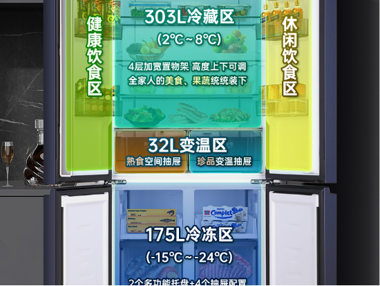 除了保鲜能力,容量一直是冰箱选购的因素之一,随着当代年轻人对容量的需求,澳柯玛BCD-510WPNE十字对开门冰箱在容量上依然没有掉队。它具备510升的超大容量,303升冷藏区+32升变温区+175升冷冻区,冷藏区具备超大隔间,无论是蛋糕还是西瓜都能轻松装下,冷冻区分为托盘和抽屉,可以将雪糕、海鲜等食材分区存储,避免串味。
