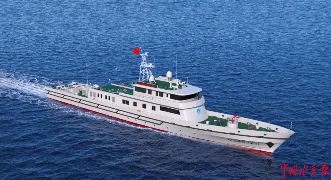 该船为钢铝复合结构,总长65.8 米,型宽 9.0 米,设计吃水 2.5 米,排水量约 590 吨。采用深 V 型船型与四机四桨推进方式,设计航速不小于 25 节,巡航航速 18 节时续航力达 1500 海里,自持力 20 昼夜,可抗 10 级风力,5 级海况下能正常执行任务。尾部配备 2 艘 全铝合金高速工作艇,艇长约 8.5 米,航速可达 40 节,搭配倾斜滑道式收放系统,可在母船低速航行或停泊时安全收放,助力近距离执法与应急救助。