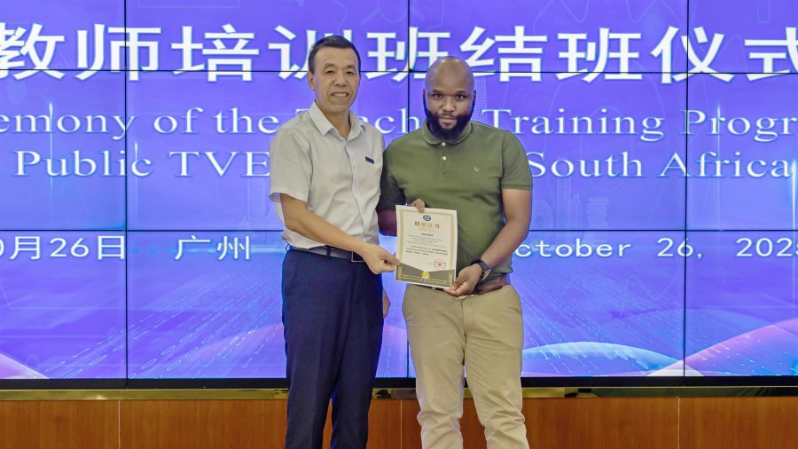 当数控铣的精密刀路跨越印度洋,当世赛金牌的技术沉淀转化为跨国交流的纽带,广东省机械技师学院的“技能出海”蓝图正在非洲大陆落地生根。2025年10月 26日,南非奥贝特公立职业学院教师培训班结班仪式在江高校区圆满举行,这既是一场跨国技能培训的完美收官,更是学校“13510”世赛成果转化模式走向全球的生动实践。