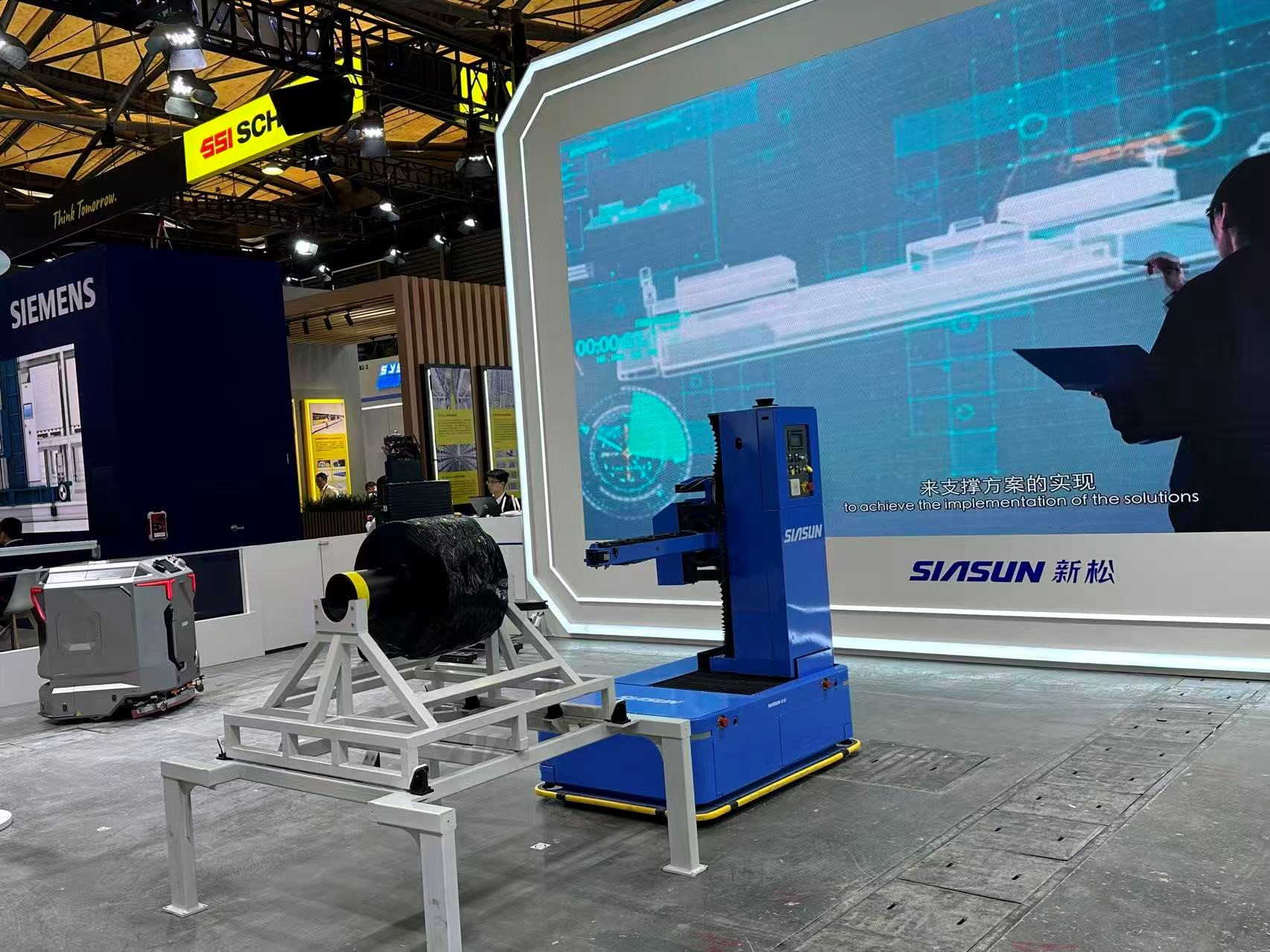 在创业板上市的新松机器人,带来了锂电行业智能移动机器人系统解决方案,包括新松悬臂轴移动机器人、新松叉式移动机器人、星卫来工业清洁机器人。