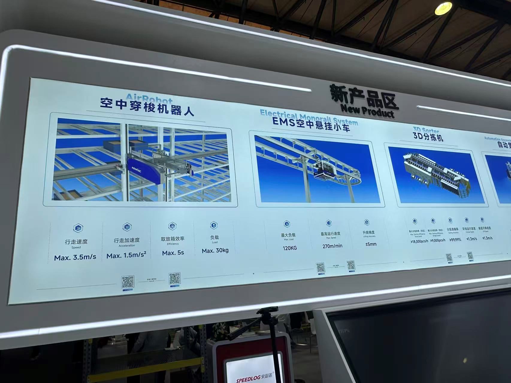 另一家科创板上市公司科捷智能也亮相2025CeMAT展,主要展示了空中穿梭机器⼈、EMS空中悬挂⼩⻋、3D分拣机、⾃动集包系统等产品。