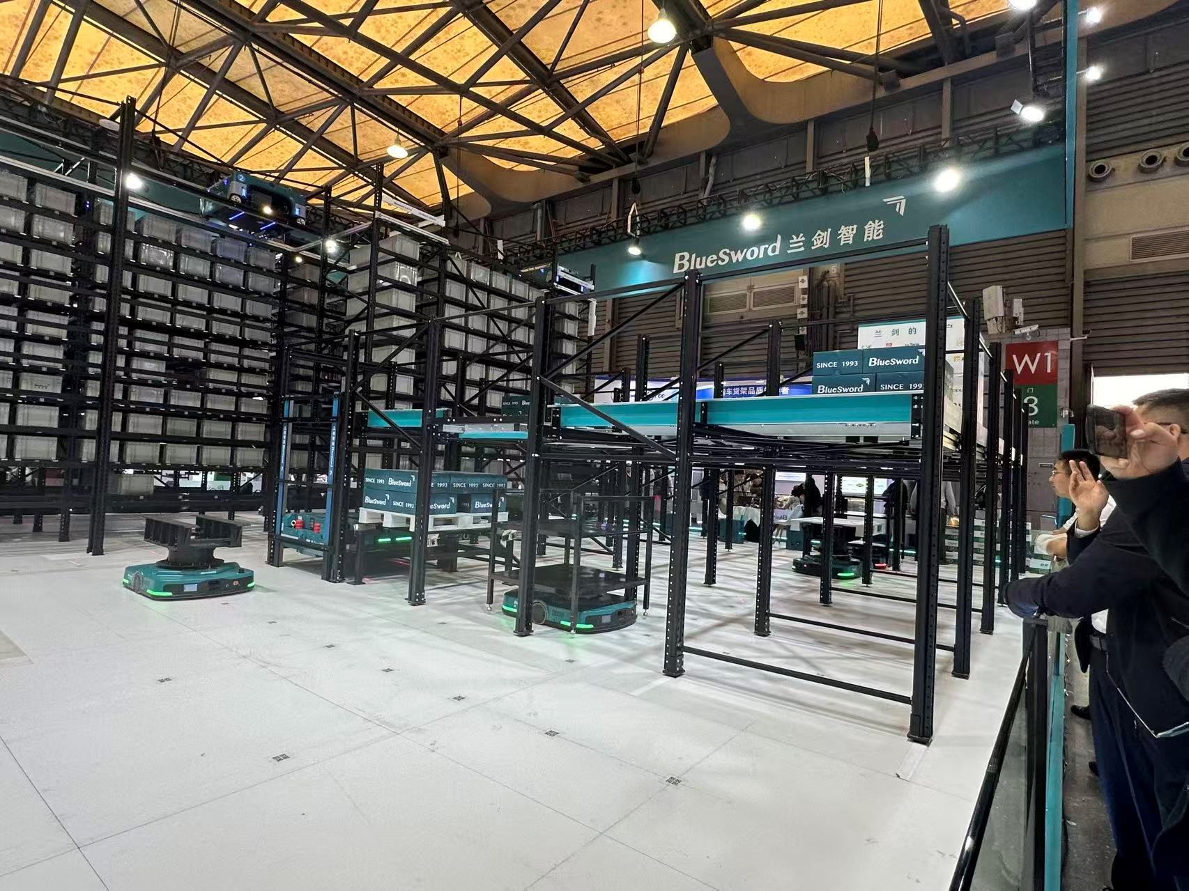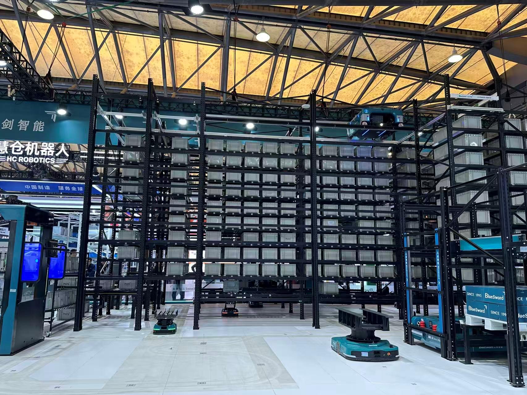 科创板上市公司兰剑智能展示了料箱级和托盘级解决方案。其中,料箱级方案展示独有的蜘蛛侠料箱机器人系统2.0版,由蜘蛛车、输送/AMR、具身智能机器人等配合完成货物拆零拣选。