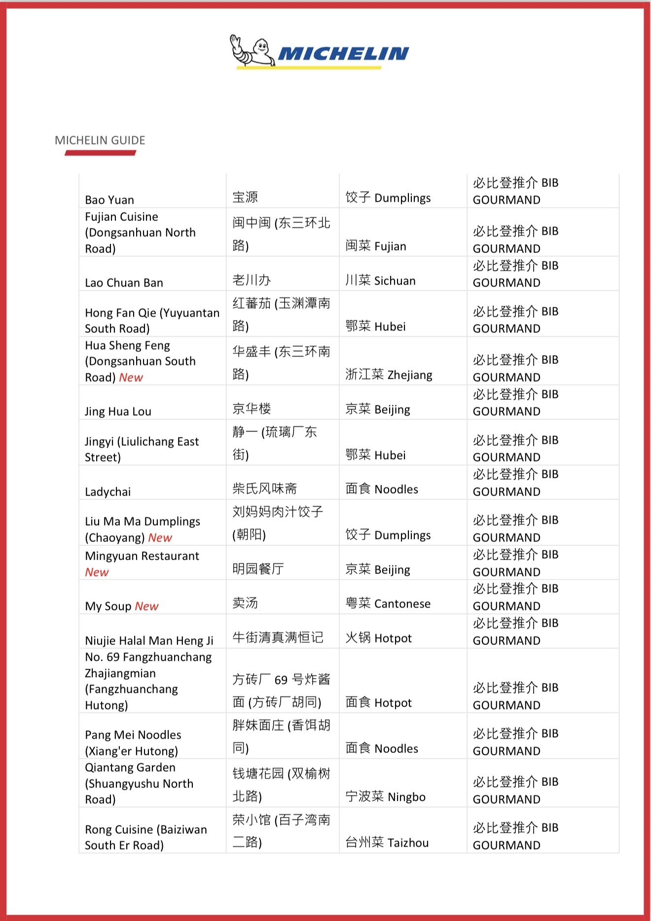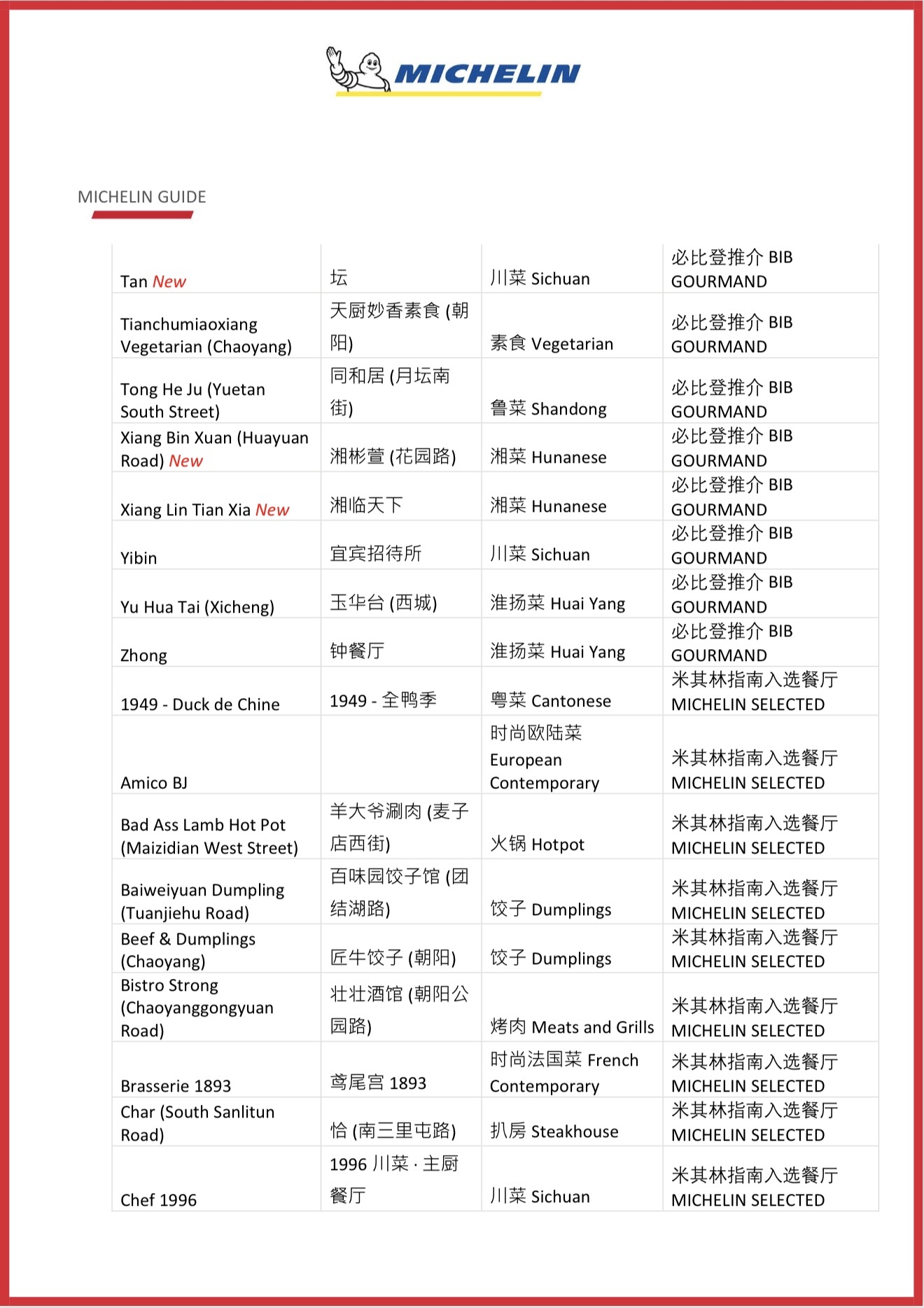 2026北京米其林指南必比登推介餐厅部分代表。图据受访者