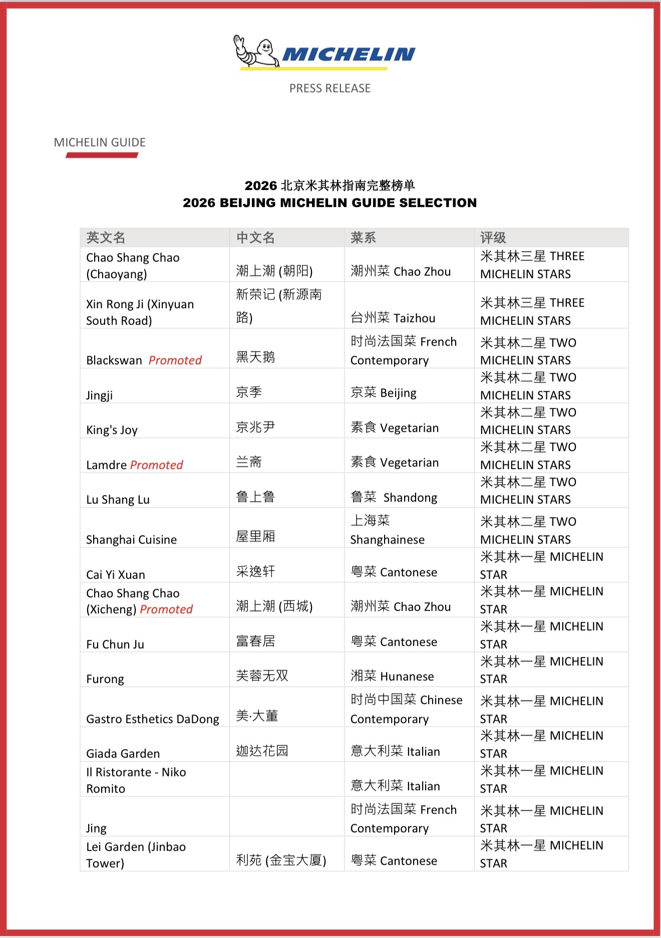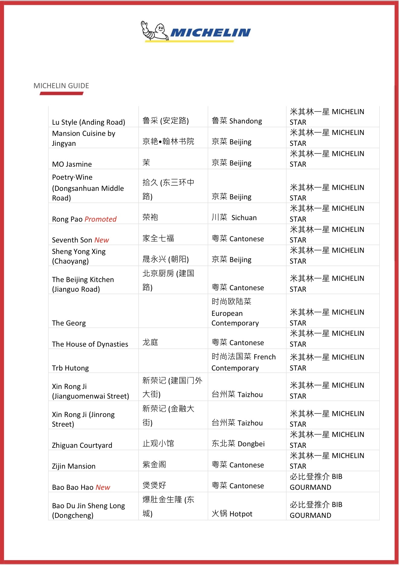 新版榜单共收录32家米其林星级餐厅,潮上潮(朝阳)和新荣记(新源南路)继续蝉联最高荣誉——米其林三星。米其林二星阵容显著扩大,两家餐厅成功晋升:它们是呈现时尚法国菜品的黑天鹅餐厅和精彩演绎蔬果食材的兰斋餐厅。京季、京兆尹、鲁上鲁和屋里厢继续蝉联米其林二星殊荣。