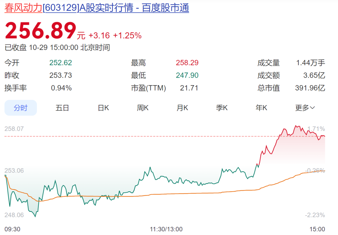 市场方面,春风动力29日收报256.89元/股,最新市值391.96亿元。