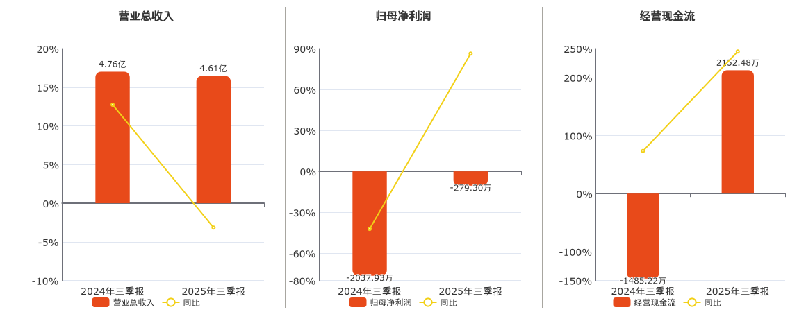 公司营业总收入为4.61亿元,在已披露的同业公司中排名第87,较去年同报告期营业总收入减少1500.26万元,同比较去年同期下降3.15%。归母净利润为-279.30万元,在已披露的同业公司中排名第95。经营活动现金净流入为2152.48万元,在已披露的同业公司中排名第83。