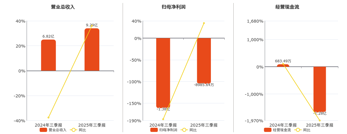 公司营业总收入为9.29亿元,在已披露的同业公司中排名第14。归母净利润为-8985.64万元,在已披露的同业公司中排名第23。经营活动现金净流入为-1.28亿元,在已披露的同业公司中排名第21,较去年同报告期经营活动现金净流入减少1.35亿元,同比较去年同期下降1969.65%。