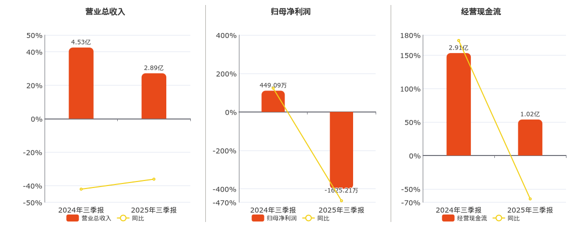 公司营业总收入为2.89亿元,较去年同报告期营业总收入减少1.64亿元,同比较去年同期下降36.16%。归母净利润为-1625.21万元,较去年同报告期归母净利润减少2074.29万元,同比较去年同期下降461.89%。经营活动现金净流入为1.02亿元,较去年同报告期经营活动现金净流入减少1.89亿元,同比较去年同期下降64.90%。