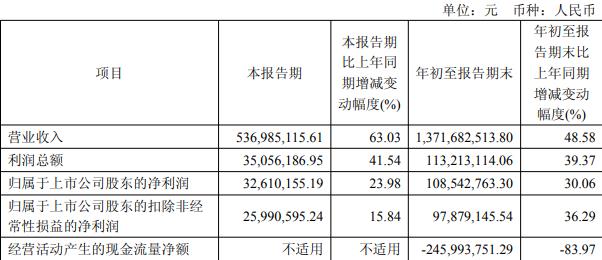 年初至报告期末,公司实现营业收入13.72亿元,同比增长48.58%;归属于上市公司股东的净利润1.09亿元,同比增长30.06%;扣除非经常性损益后的净利润9787.91万元,同比增长36.29%,经营活动产生的现金流量净额-2.46亿元。