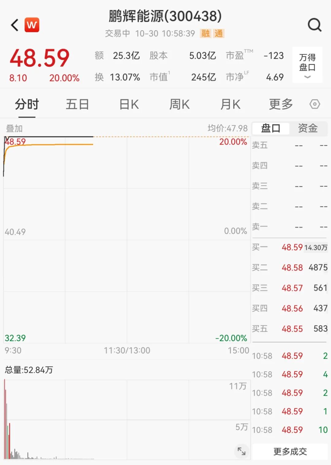 10月30日,钠离子电池概念板块上涨,开盘1分钟,鹏辉能源录得20cm涨停。