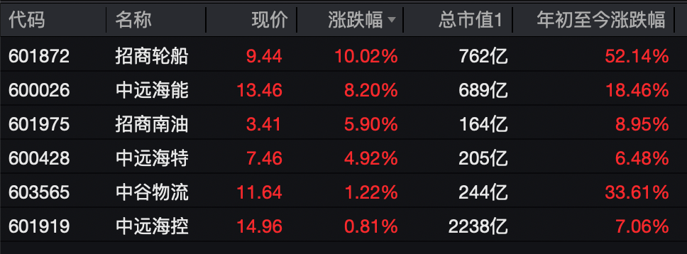 个股方面,招商轮船触及涨停,中远海能、华光源海涨超8%,招商南油、中远海特、凤凰航运跟涨。