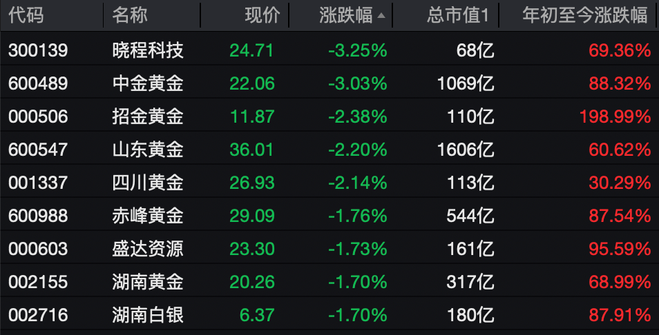 个股方面,晓程科技跌逾3%,中金黄金、招金黄金、山东黄金、四川黄金等相关个股纷纷下跌。