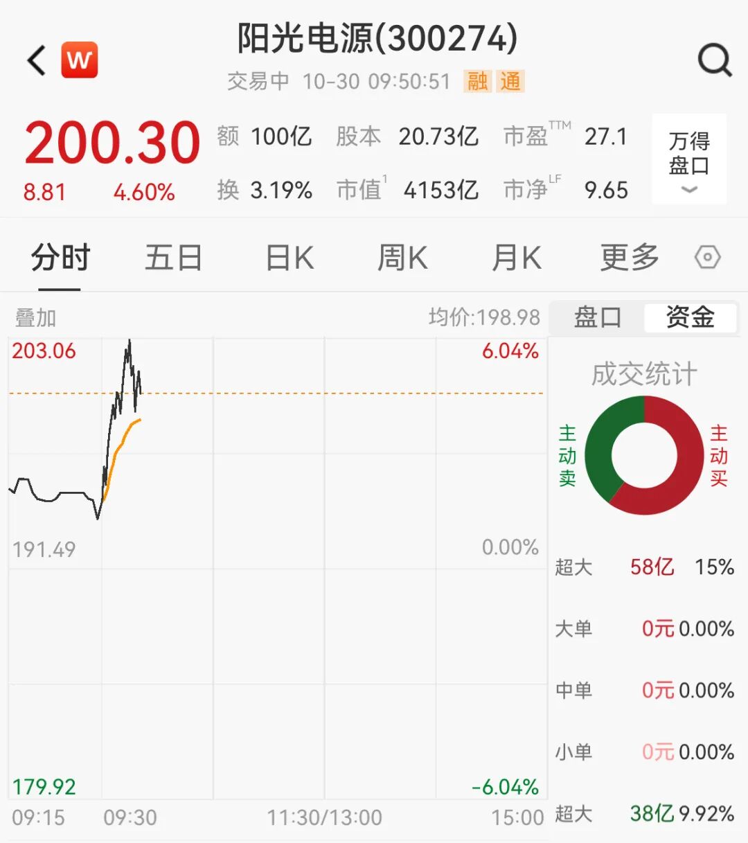 10月30日,阳光电源股价突破200元,日内涨超4%,总市值超4100亿元。