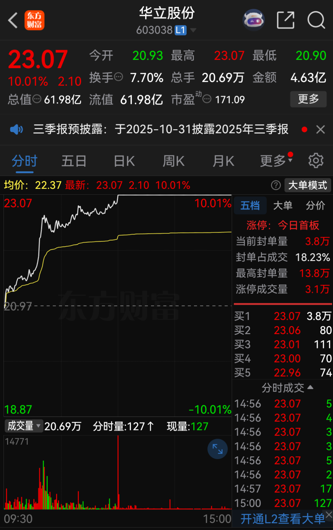 截至10月29日收盘,华立股份股价报23.07元/股,涨幅达10.01%,总市值为61.98亿元。