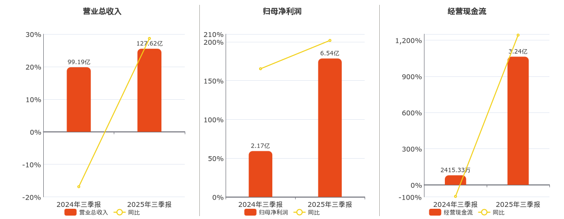 公司营业总收入为127.62亿元。归母净利润为6.54亿元。经营活动现金净流入为3.24亿元。