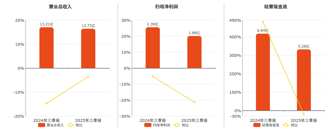 公司营业总收入为12.73亿元,在已披露的同业公司中排名第32,较去年同报告期营业总收入减少4781.36万元,同比较去年同期下降3.62%。归母净利润为1.88亿元,在已披露的同业公司中排名第11,较去年同报告期归母净利润减少5105.96万元,同比较去年同期下降21.34%。经营活动现金净流入为5.28亿元,在已披露的同业公司中排名第18,较去年同报告期经营活动现金净流入减少1.36亿元,同比较去年同期下降20.52%。