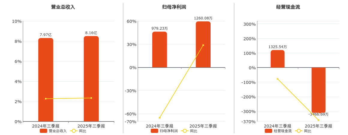公司营业总收入为8.16亿元,较去年同报告期营业总收入增加1859.02万元,实现3年连续上涨,同比较去年同期上涨2.33%。归母净利润为1260.08万元,较去年同报告期归母净利润增加280.84万元,同比较去年同期上涨28.68%。经营活动现金净流入为-3466.69万元。
