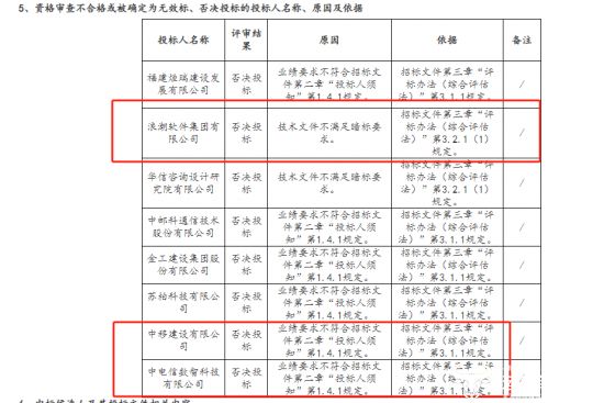 其中,浪潮软件集团有限公司因技术文件不满足暗标要求被否决;中移建设有限公司因业绩要求不符合招标文件有关规定被否决;中国电信旗下的某专业公司也是因为业绩要求不符合招标文件相应规定被否决。