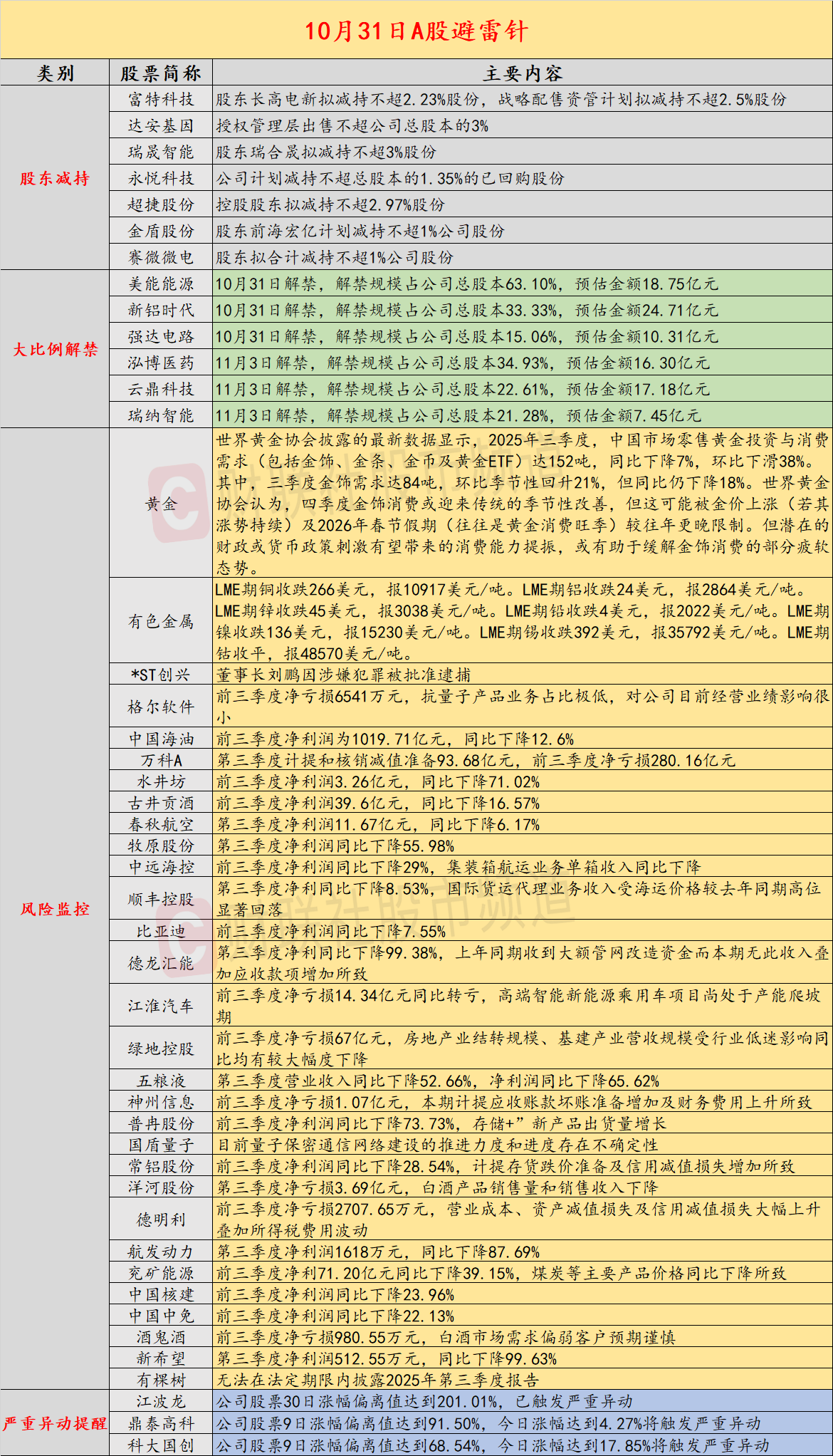 导读:财联社10月31日投资避雷针,近日,A股及海外市场潜在风险事件如下。国内经济信息方面包括:1)三季度中国市场零售黄金投资与消费需求同比下降7%,环比下滑38%;2)三季度,抖音共处置非法荐股等金融违规内容超10万条;公司方面重点关注包括:1)*ST创兴董事长刘鹏因涉嫌犯罪被批准逮捕;2)6天4板格尔软件前三季度净亏损6541万元,抗量子产品业务占比极低,对公司目前经营业绩影响很小;海外市场重点关注包括:1)美股三大指数集体收跌,Meta创三年以来最大单日跌幅;2)LME期铜收跌266美元,报10917美元/吨。