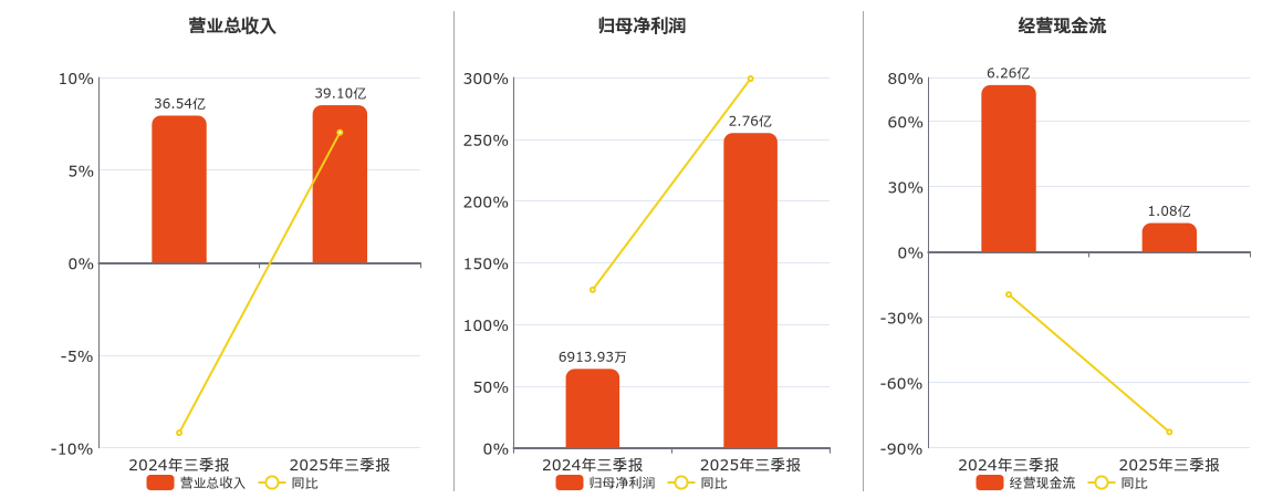 公司营业总收入为39.10亿元。归母净利润为2.76亿元。经营活动现金净流入为1.08亿元,较去年同报告期经营活动现金净流入减少5.18亿元,同比较去年同期下降82.77%。