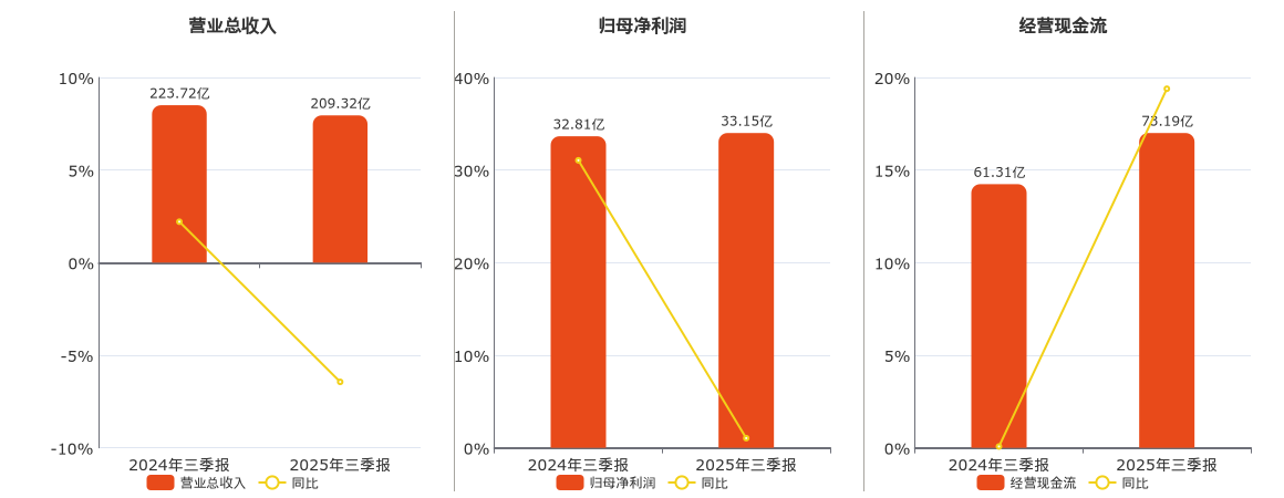 公司营业总收入为209.32亿元,在已披露的同业公司中排名第21。归母净利润为33.15亿元,在已披露的同业公司中排名第15,较去年同报告期归母净利润增加3396.07万元,实现3年连续上涨,同比较去年同期上涨1.04%。经营活动现金净流入为73.19亿元,在已披露的同业公司中排名第17,较去年同报告期经营活动现金净流入增加11.89亿元,实现4年连续上涨,同比较去年同期上涨19.39%。