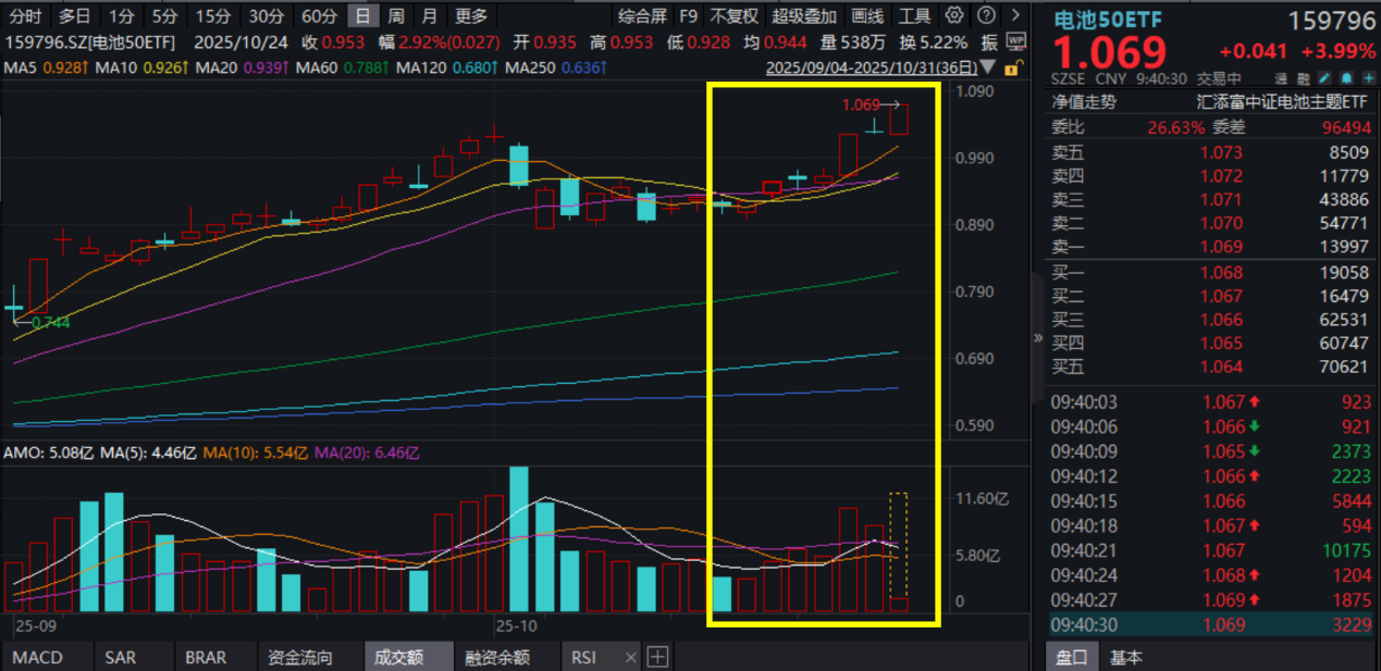 10月31日,电力设备再度领衔大涨,电池板块一马当先。截至9:40,同类规模领先、费率最低档的电池50ETF(159796)直线飙升放量大涨4%,成交额快速突破3亿元。