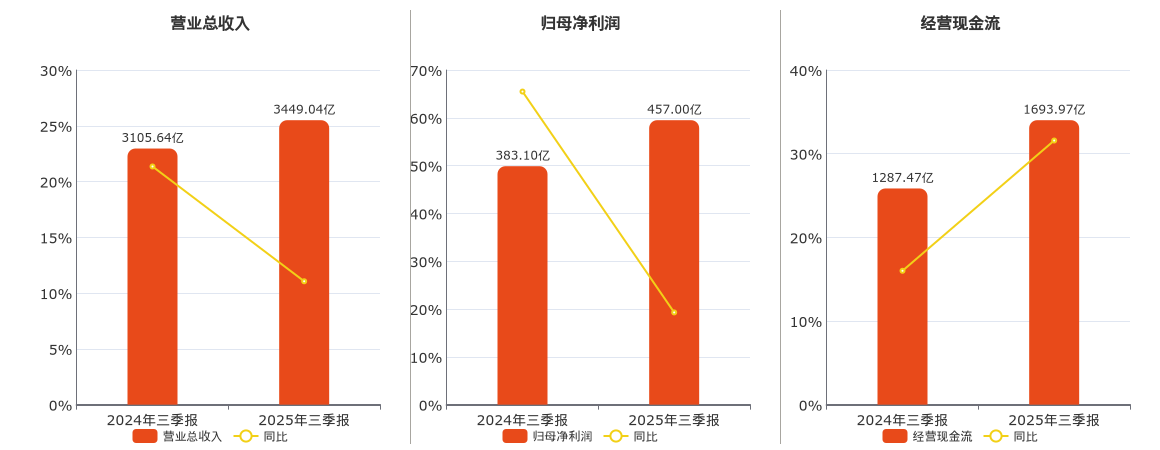 公司营业总收入为3449.04亿元,较去年同报告期营业总收入增加343.40亿元,实现3年连续上涨,同比较去年同期上涨11.06%。归母净利润为457.00亿元,较去年同报告期归母净利润增加73.90亿元,实现2年连续上涨,同比较去年同期上涨19.29%。经营活动现金净流入为1693.97亿元,较去年同报告期经营活动现金净流入增加406.50亿元,实现4年连续上涨,同比较去年同期上涨31.57%。
