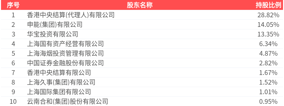 公司股东户数为10.20万户,前十大股东持股数量为72.55亿股,占总股本比例为75.42%,前十大股东持股情况如下: