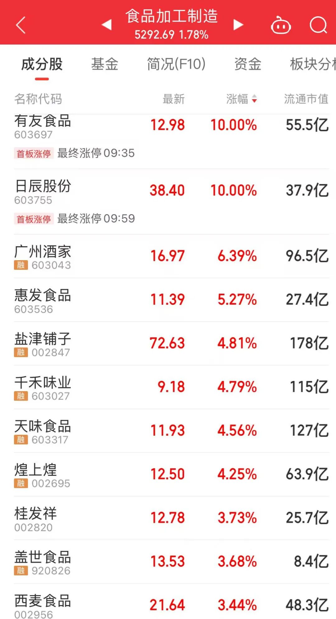 食品加工制造板块中,有友食品、日辰股份等个股大涨。