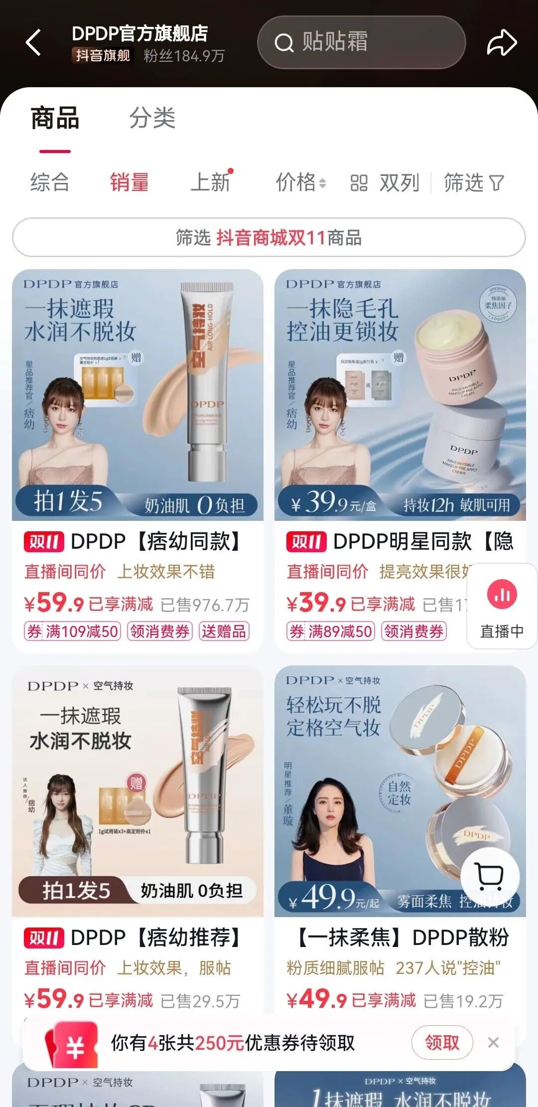 产品布局方面,DPDP已构建覆盖粉底液、定妆散粉、蜜粉饼、隔离妆前乳、气垫、口红、卸妆产品、遮瑕、修容及眼影高光等品类的全链路彩妆矩阵,产品均价集中在50-100元区间。
